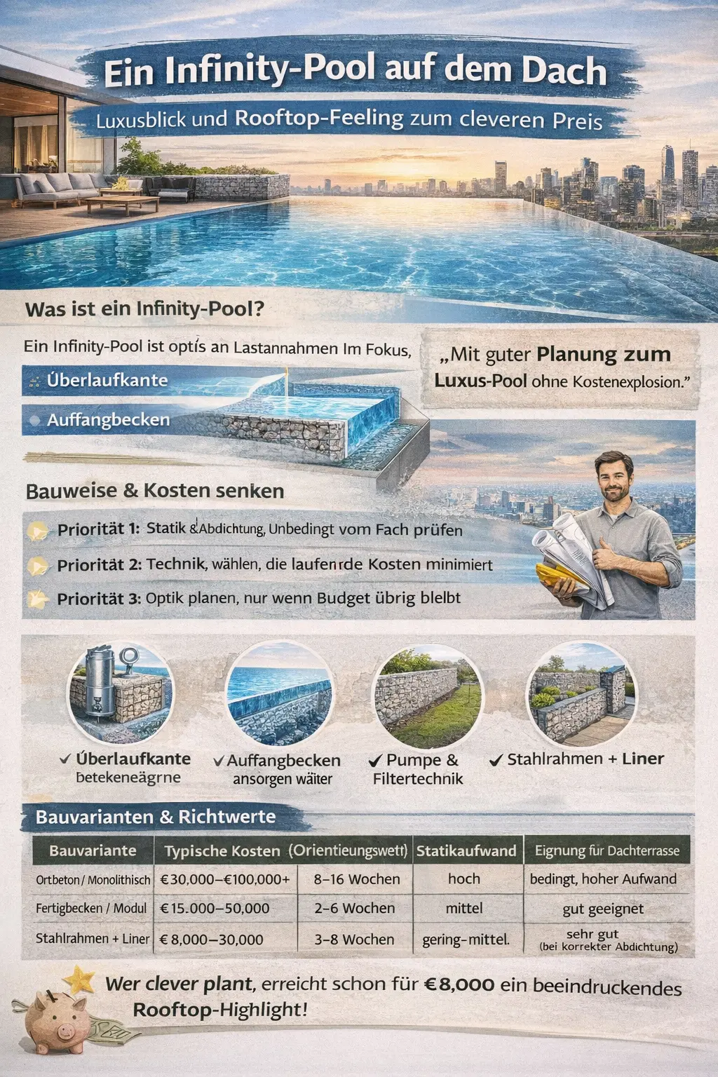 Ein Infinity-Pool auf dem Dach lässt Blicke kleben, weil Wasser scheinbar in den Horizont läuft und die Skyline eins wird. Schon beim ersten Schritt auf die Terrasse entsteht dieses Gefühl von Weite, und genau das verkaufen Hotels gern als Erlebnis. Wer jetzt denkt, so etwas geht nur mit Millionenausgaben, sollte weiterlesen, denn es gibt clevere Wege, den Effekt kostengünstig herzustellen. Kurz gesagt: mit kluger Planung, gezielten Prioritäten und dem richtigen Material lässt sich ein echtes Luxuselement realisieren, ohne dass der Geldbeutel platzt. Wer den Effekt plant, schaut meist zuerst auf pool kosten und nutzt einen pool kostenrechner, um Größenordnung und Prioritäten realistisch abzustecken.