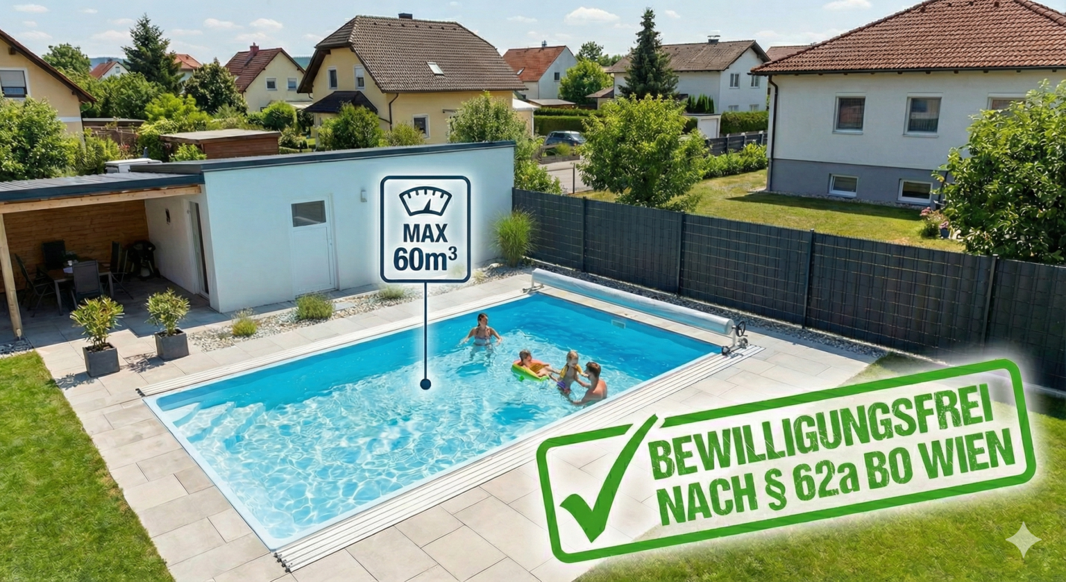 Dieser Leitfaden klärt auf, wann Ihr Pool in Wien gemäß § 62a der Wiener Bauordnung verfahrensfrei bleibt.