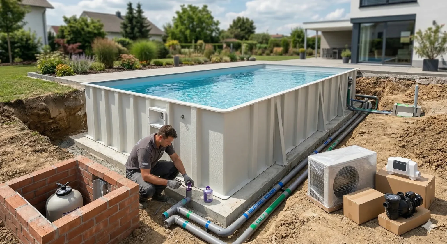 Ein Pool ist ein massives Bauwerk, das fest in Ihrem Garten verankert wird. Wenn Ihre Wärmepumpe in acht Jahren kaputtgeht, tauschen Sie ein Gerät aus – Aufwand: 1 Stunde. Wenn Ihr billiges GFK-Becken nach zehn Jahren Risse oder Osmose bekommt, müssen Sie den halben Garten aufbaggern, die Terrasse zerstören und das Becken herausreißen – Kosten: oft über 20.000 €.